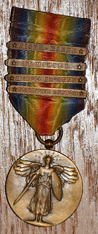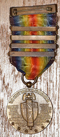 Medal awarded to soldiers who fought in particular campaigns. Two pictures, with front and back of the hanging medallion. Actions my grandfather participated in were the Aisne-Marne, St. Mihiel, Meuse-Argonne, and the Defensive Sector.